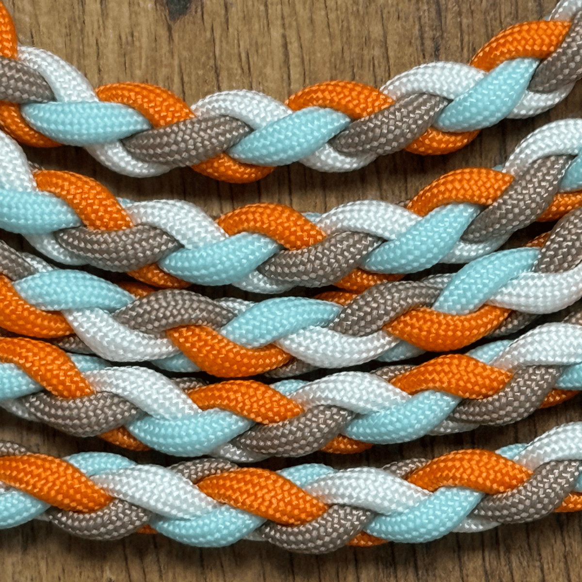 Für unsere handgefertigten Leinen verwenden wir Paracord Type III 550, meist mit einem Durchmesser von etwa 4 mm. Diese Stärke bietet das beste Verhältnis aus Gewicht, Flexibilität und Bruchlast.